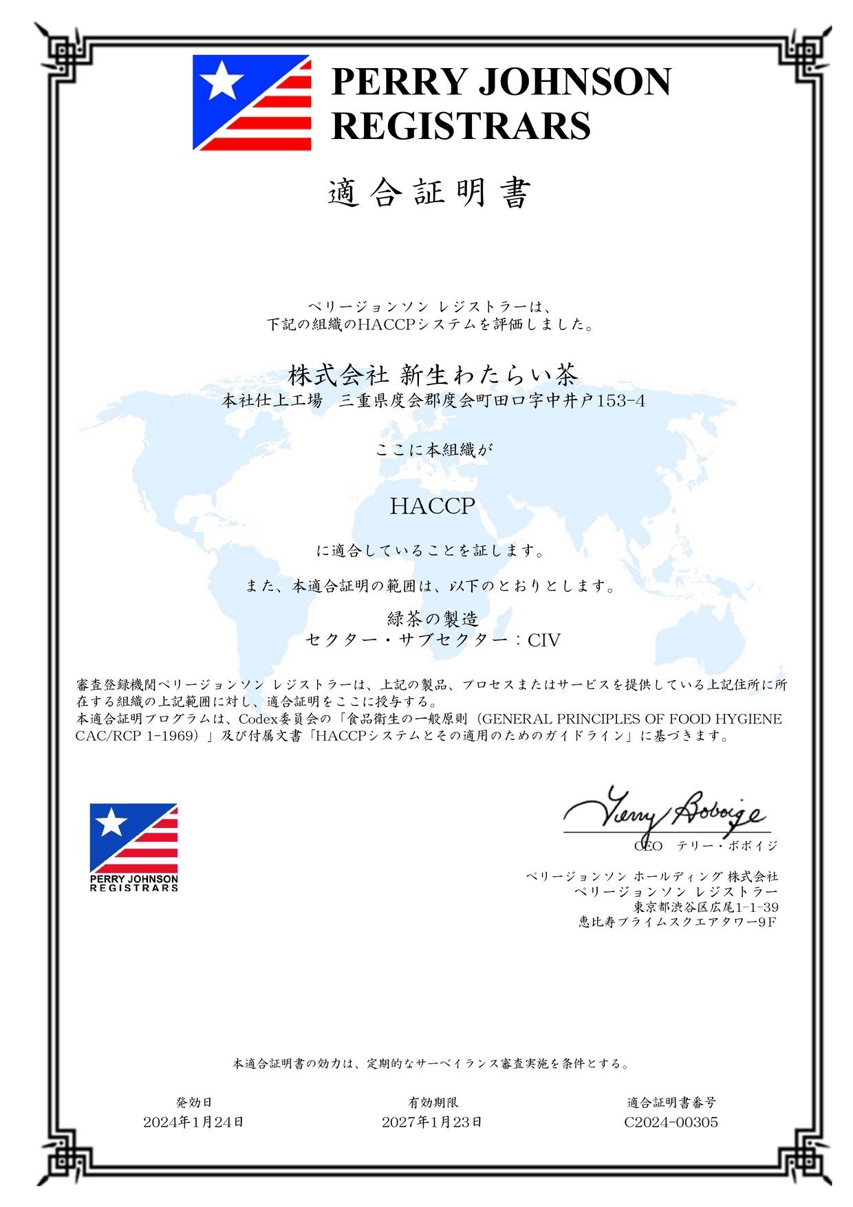 新生わたらい茶は2018年に一般財団法人食品マネジメント協会(JFSM)が定める「JFS-B規格」の適合証明を取得しました。※緑茶の製造(紅茶、抹茶を除く)