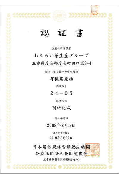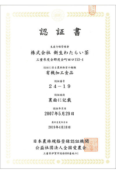 新生わたらい茶では生産農家の荒茶生産、及びその後の製品化の加工も一貫して行うため、有機農産物と有機加工食品の生産行程管理者の認定を取得しております。
